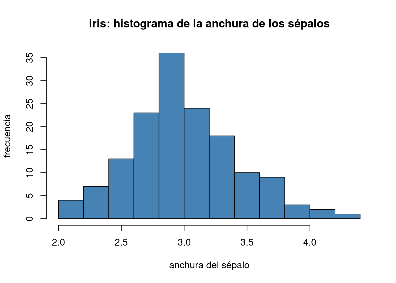 hist(iris$Sepal.Width, main = "iris: histograma de la anchura de los sépalos",