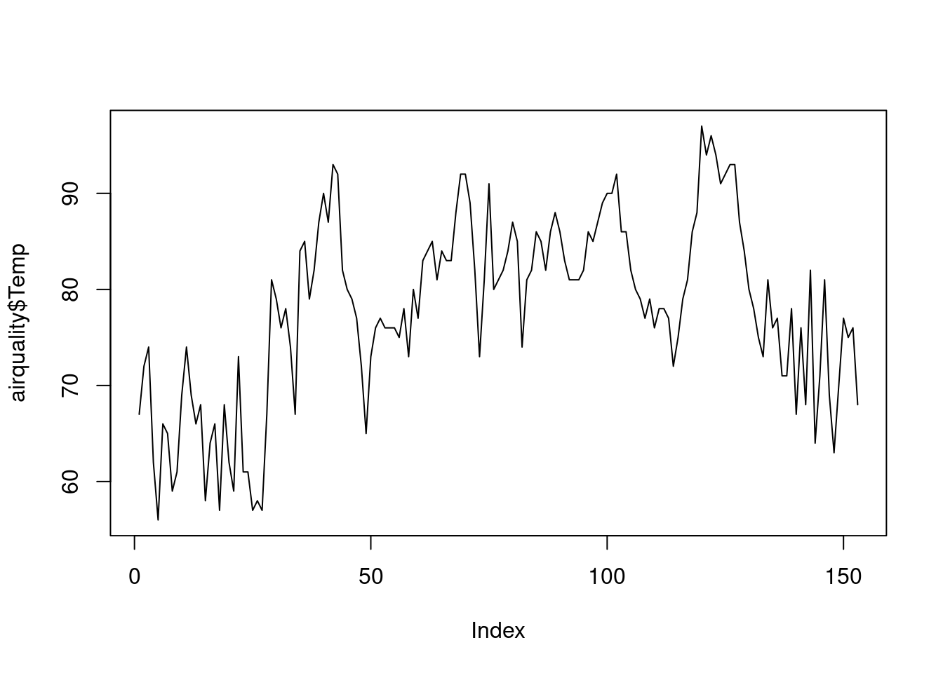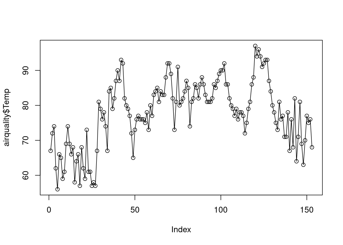 En ocasiones, cuando una de las variables tiene un orden determinado (por ejemplo, es una variable temporal) pueden utilizarse líneas para unir los puntos de un diagrama de dispersión (o, más habitualmente, reemplazarlos por ellas). Por ejemplo, utilizando el hecho de que las observaciones de airquality están ordenadas temporalmente, podemos representar la temperatura en periodo que comprende así: