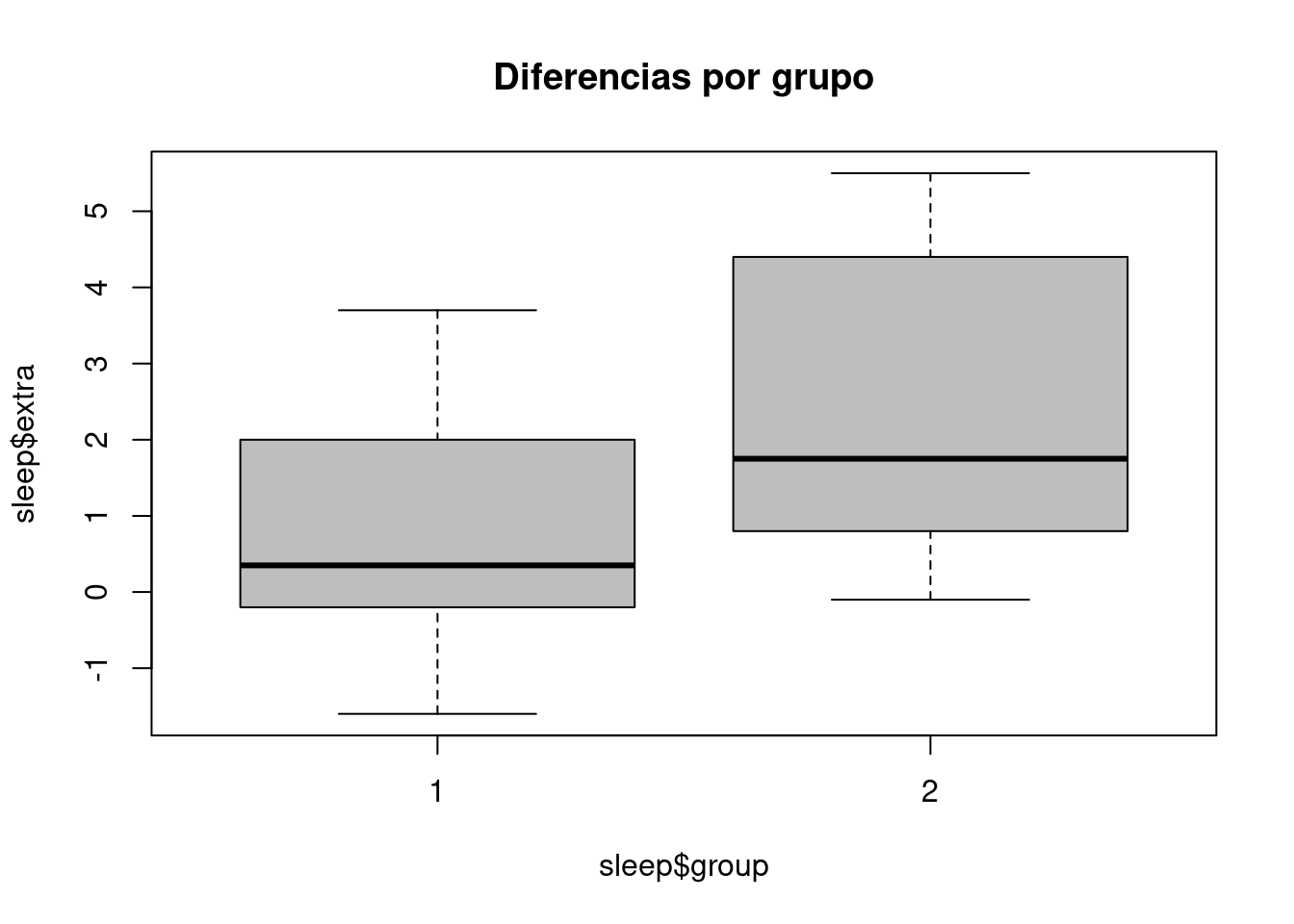 boxplot(sleep$extra ~ sleep$group, col ="gray",main ="Diferencias por grupo")