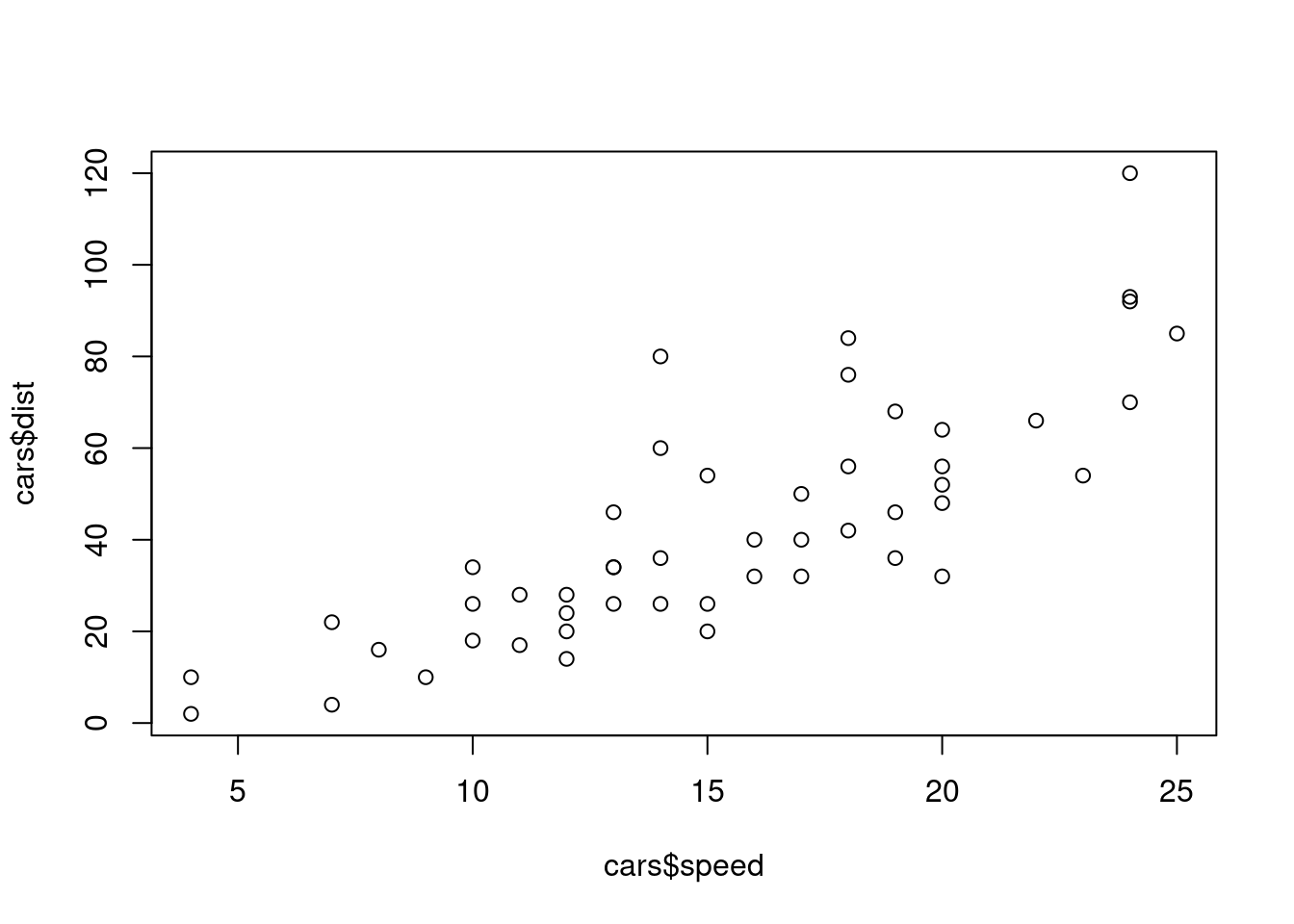Existe una relación creciente entre las variables velocidad y distancia en el conjunto de datos cars. En efecto, a mayor velocidad, mayor es la distancia de frenado de los vehículos: