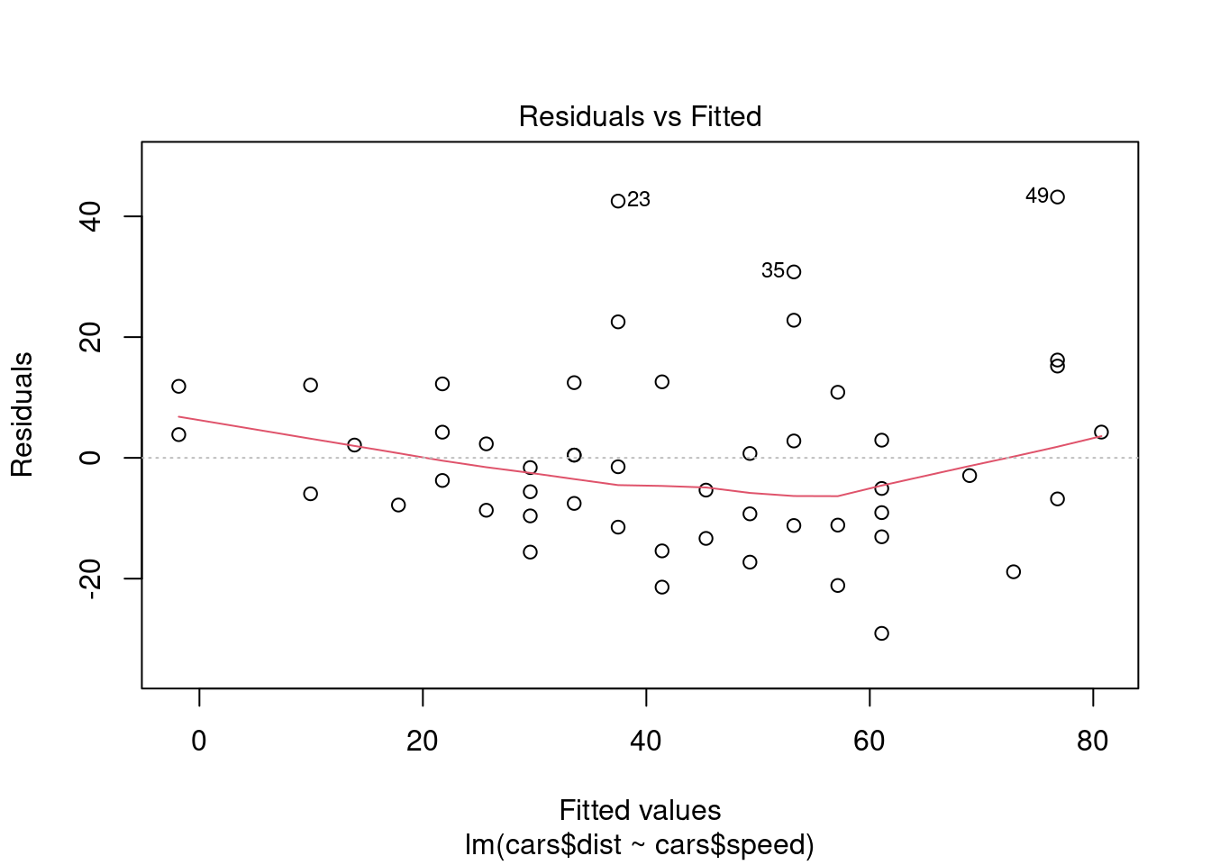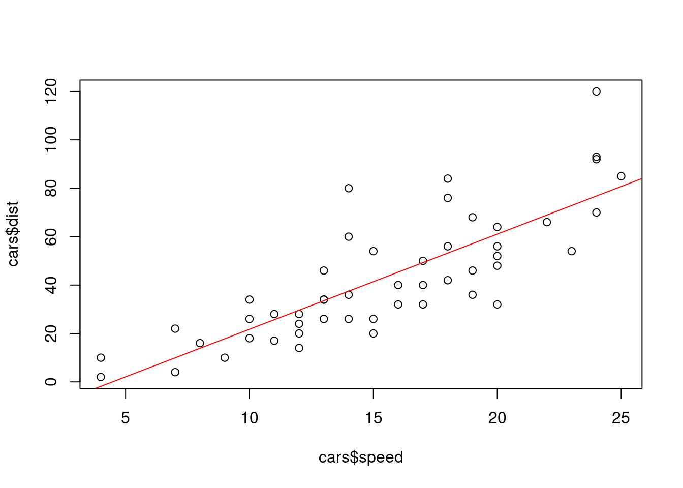 plot(cars$speed, cars$dist)abline(lm.dist.speed, col ="red")