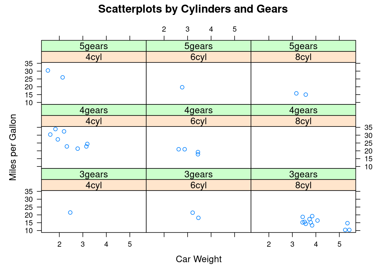 Los gráficos de Trellis permiten seguir el comportamiento de unas variables de interés a través de los distintos niveles de otras, disponiendo la información en una retícula que facilita el descubrimiento de patrones por inspección visual. El gráfico anterior muestra la relación entre el peso y el consumo de gasolina de una serie de vehículos en función de su número de cilindros y el número de marchas. La relación es más evidente usando un gráfico de Trellis que, por ejemplo, usando colores (o formas) para representar el número de cilindros o marchas en un único gráfico de dispersión.