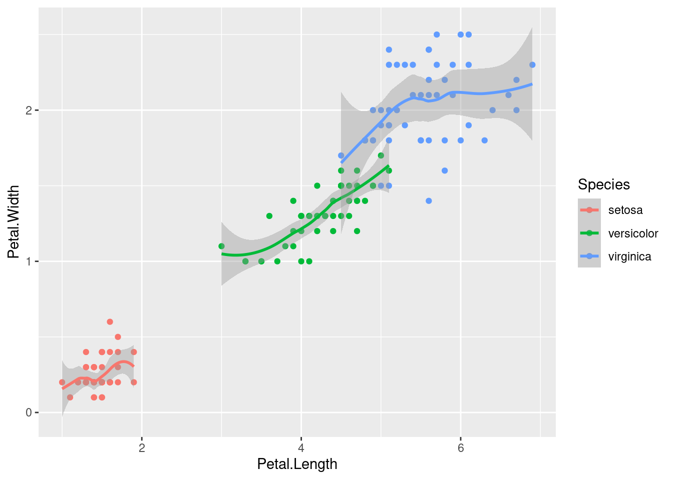 ggplot(iris, aes(x = Petal.Length, y = Petal.Width, colour = Species)) +