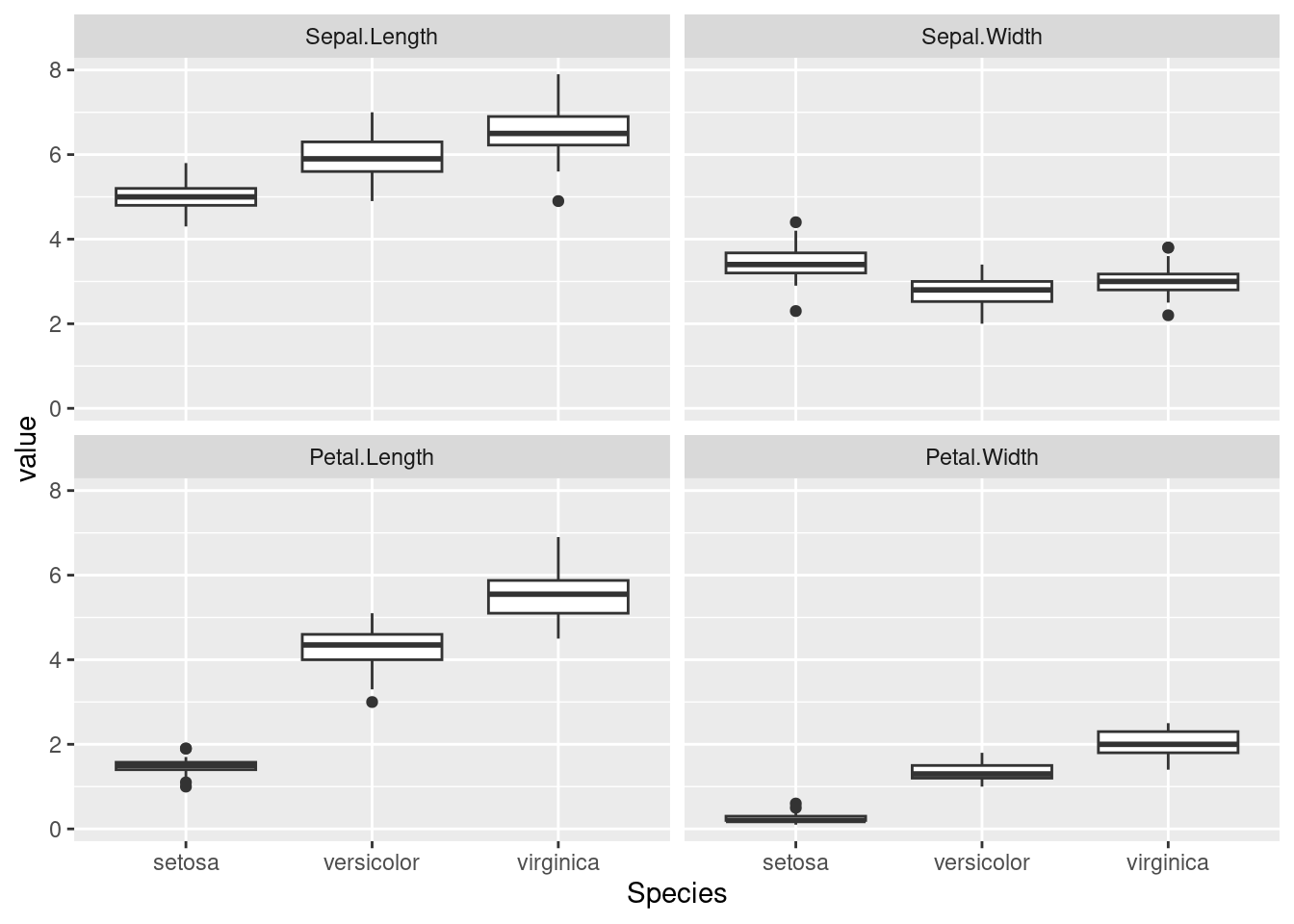 ggplot(tmp, aes(x = Species, y = value)) + geom_boxplot() + facet_wrap(~ variable)