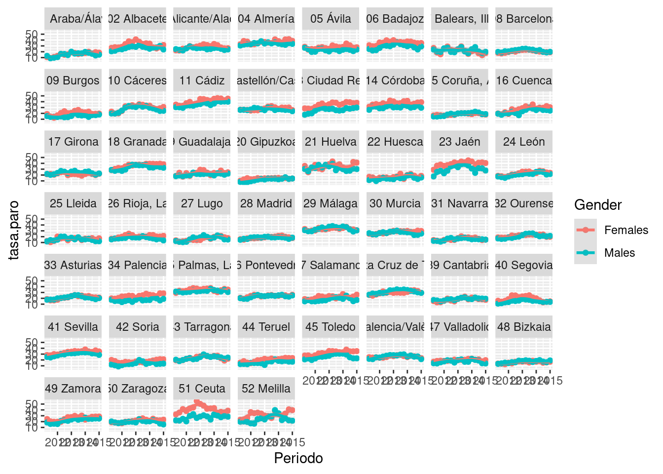 En caso de haber muchas categorías (p.e., provincia), puede usarse la función facet_wrap para distribuir las subgráficas en una cuadrícula.