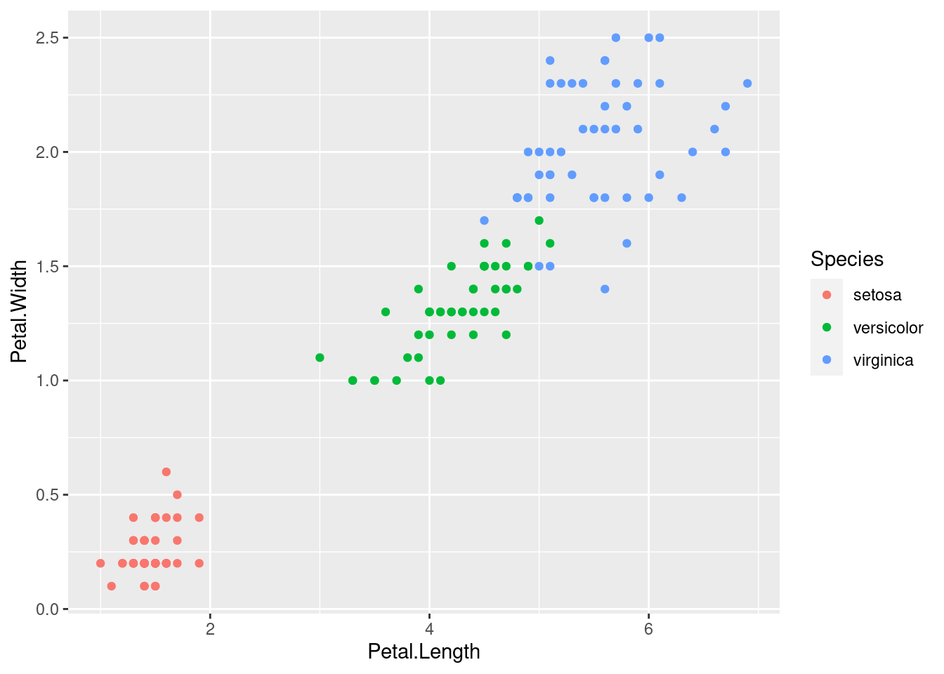 mapping: x = ~Petal.Length, y = ~Petal.Width, colour = ~Species