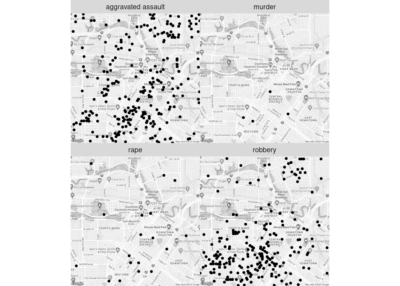 crimes.houston <- subset(crime, ! crime$offense %in% c("auto theft", "theft", "burglary"))9.2.1 Puntos sobre mapas