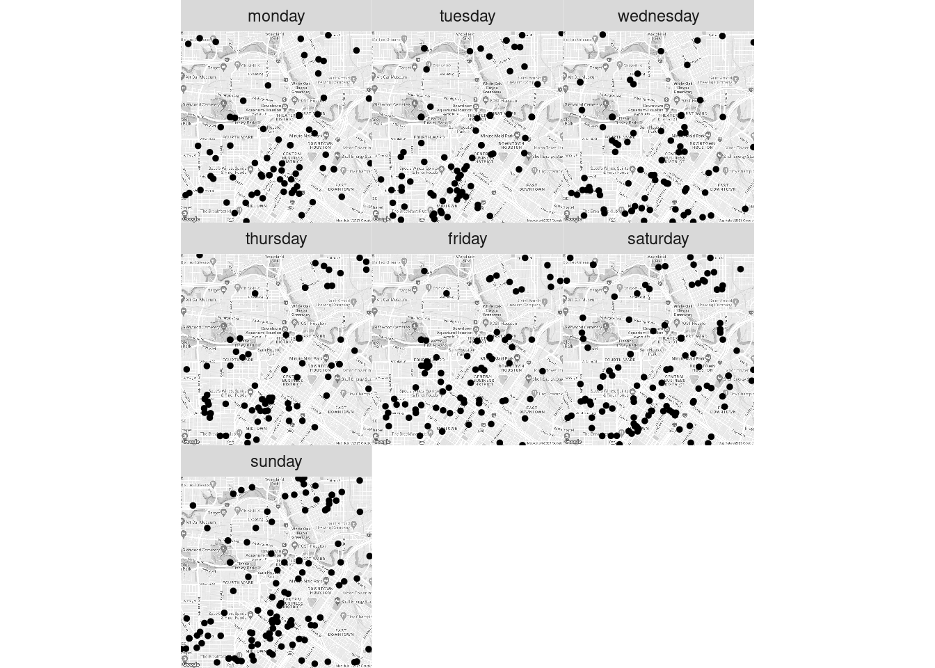 O se puede usar stat_density2d, que representa intensidades, para identificar las zonas de mayor criminalidad.