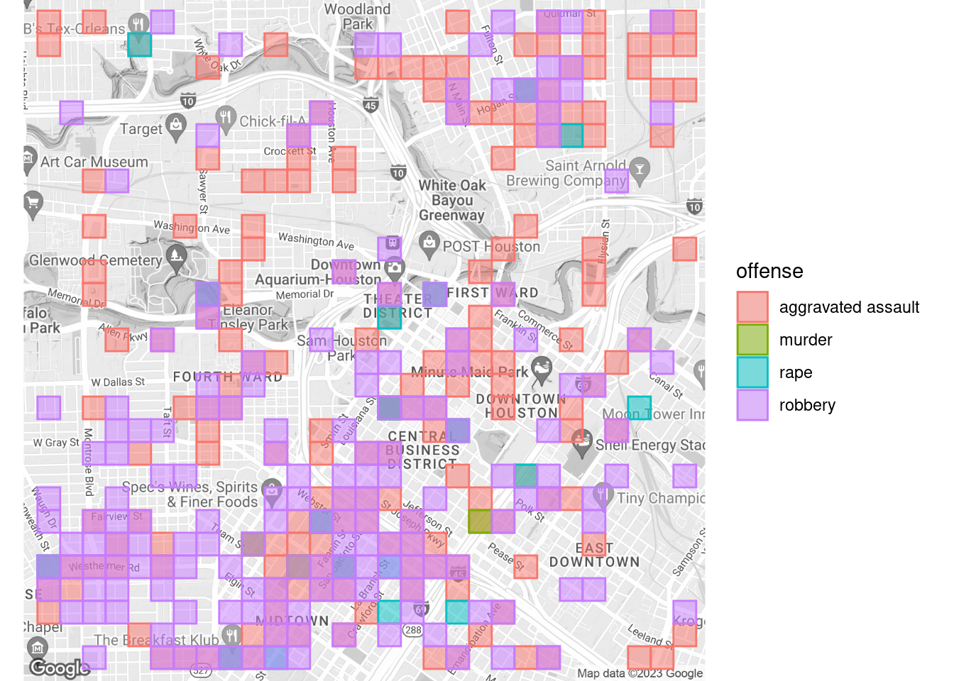 En los ejemplos que siguen se va a utilizar el conjunto de datos crimes que forma parte del paquete ggmap y que incluye información geolocalizada de crímenes cometidos en la ciudad de Houston. En realidad, solo consideraremos los crímenes serios, es decir,