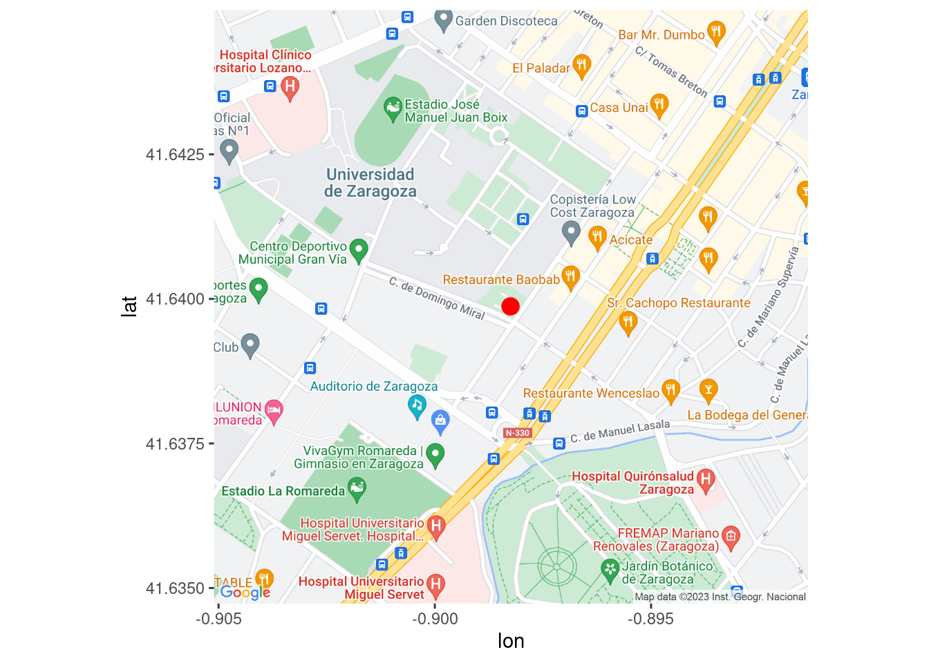 ggmap(map.unizar) + geom_point(aes(x = lon, y = lat),