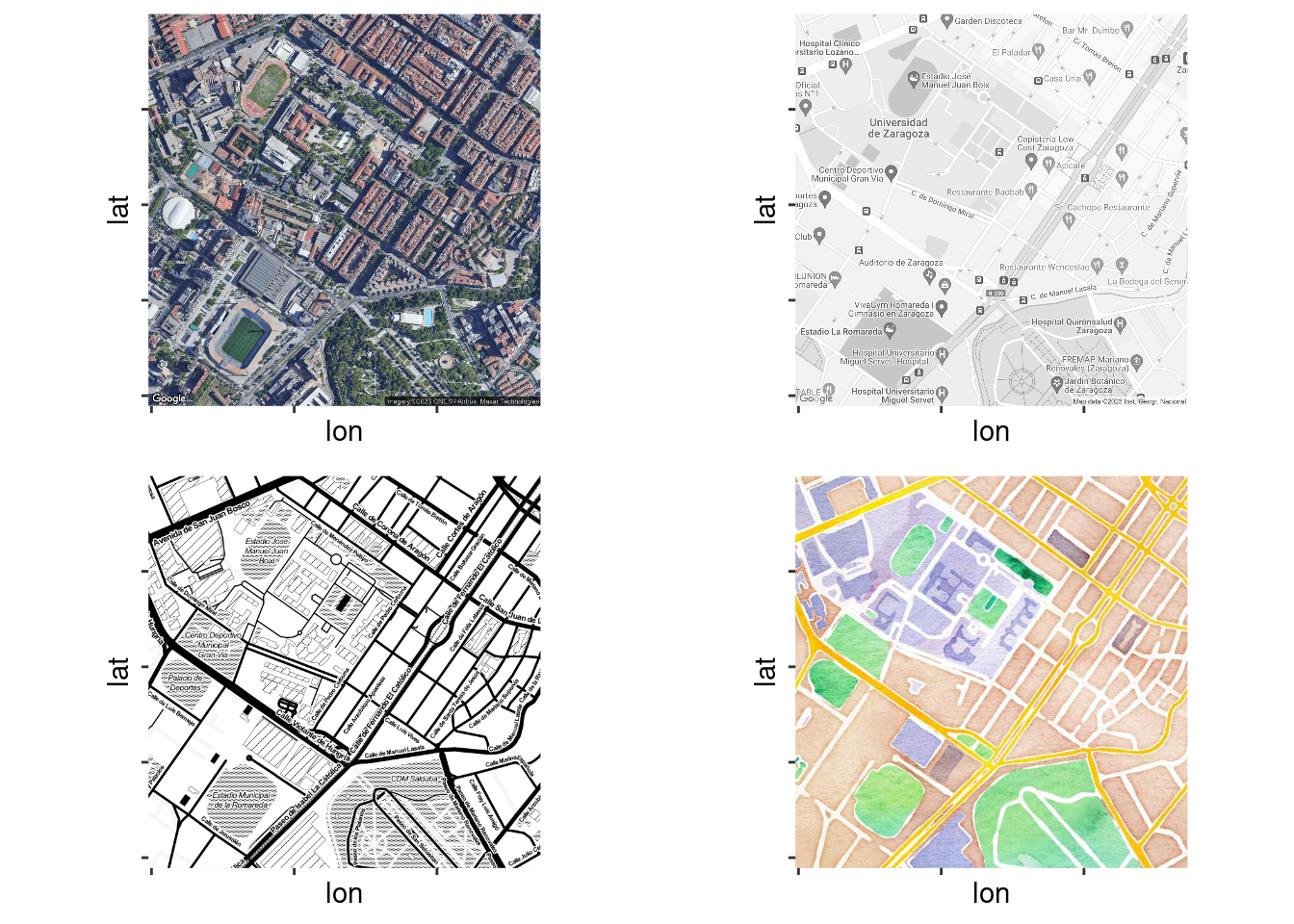 - Funciones para obtener mapas (de diversos tipos y de distintos orígenes: Google, Stamen, OpenStreetMap)