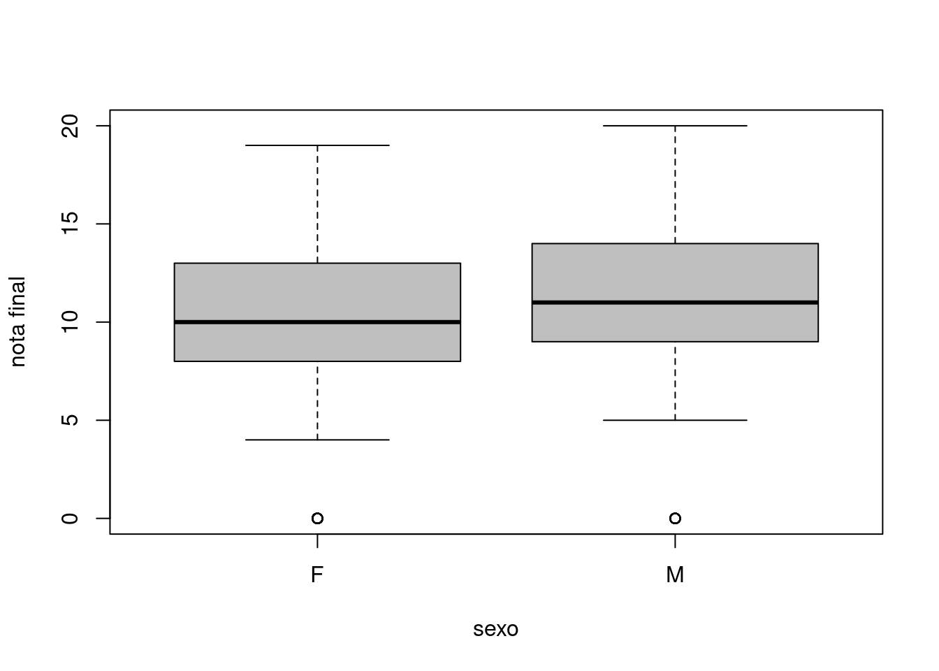 boxplot(mat.por$G3 ~ mat.por$sex, col = "gray", xlab = "sexo", ylab = "nota final")