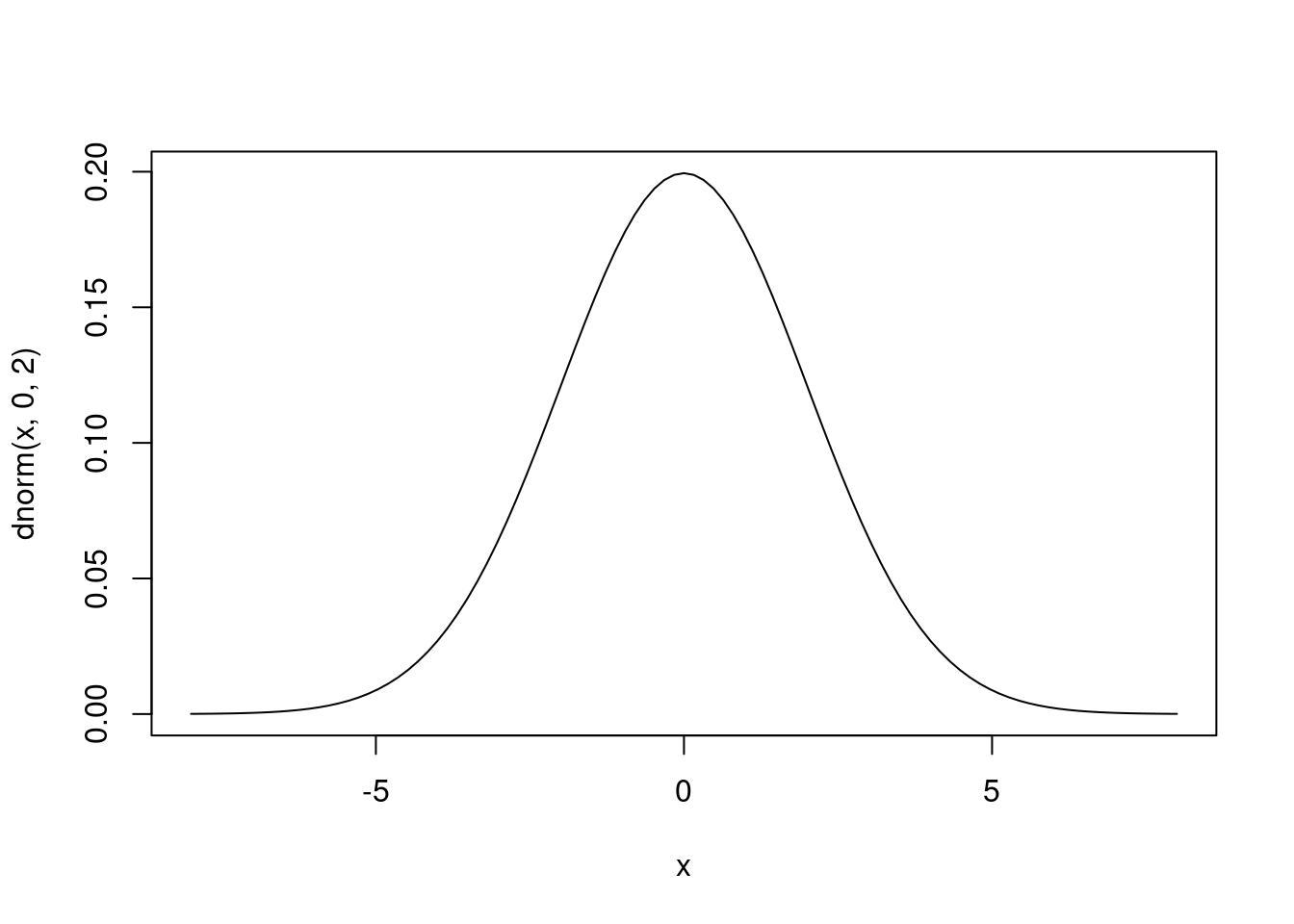 La función que comienza por d es la densidad1 de la distribución. Por ejemplo, la función dnorm es la famosa campana de Gauss. Se puede representar con la función curve: