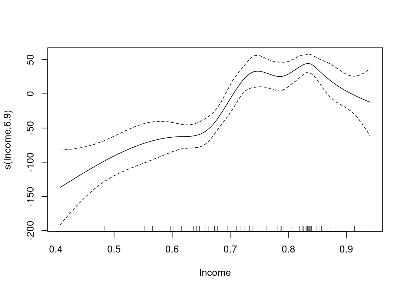 Lo interesante es que gam permite introducir términos especiales para modelar efectos no lineales. Por ejemplo, en estos datos, los ingresos. El gráfico generado ilustra el impacto (no lineal) del ingreso sobre la variable objetivo.