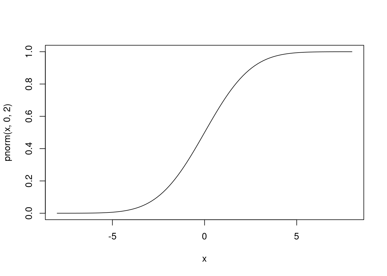 La función que comienza por p es la función de probabilidad, que es la integral de la densidad. En concreto, si la función de densidad es \(f\), la función de probabilidad, \(F\), es