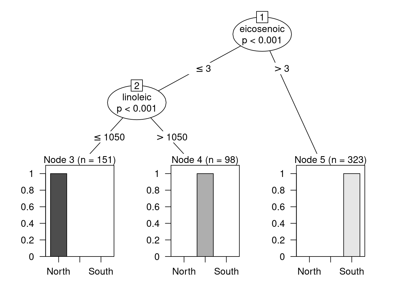 Como puede apreciarse, la predicción es perfecta: en los nodos finales no hay confusión de regiones. Por ejemplo, el nodo terminal de la derecha, el que se construye con la regla eicosenoic > 3, contiene únicamente aceites procedentes de la zona sur de Italia. Por lo tanto, siempre que un aceite cumpla dicha regla, se categorizará como procedente de esa región.