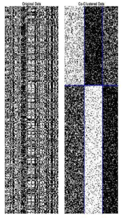 Esto es: la entrada es una matriz y la salida es una matriz reorganizada tanto en sus filas como en sus columnas en la que se han detectado bloques homogéneos.