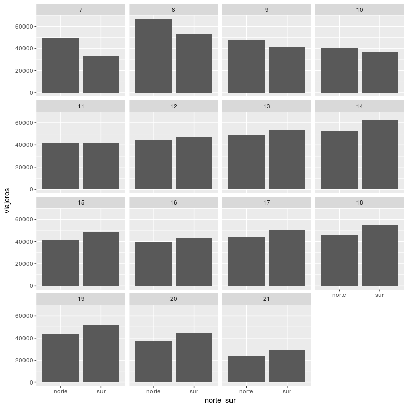 He contado, por horas, cuánta gente viajó en ese primer tramo, hacia el norte y quién lo hizo hacia el sur y he obtenido