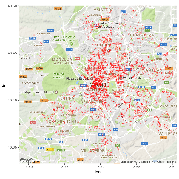 es un mapa en el que, en rojo, figuran todas (véase la coda) las terrazas de Madrid. Los datos están extraídos del censo de locales, sus actividades y terrazas de hostelería y restauración del ayuntamiento y están procesados con