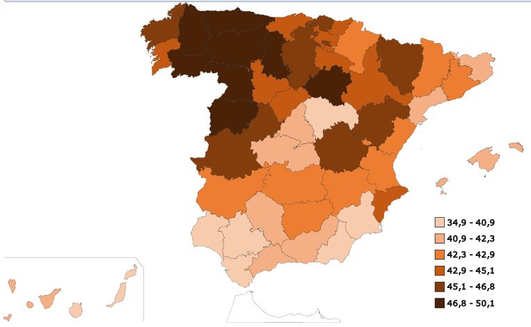 me llegó ayer por Twitter (vía @unnombrealazar). En el mapa aparece representada la edad media de la población por provincia (y hoy voy a dar las cloropetas por buenas). Salta a la vista Guadalajara: tiene una edad media ¿sorprendentemente? baja. Tanto que tuve que comprobarlo en el INE. La explicación (siempre a posteriori) más obvia es